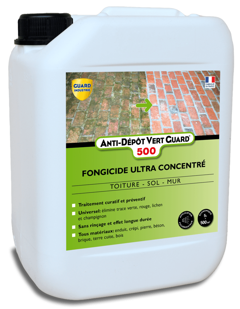 Anti-Dépôt Vert Guard® 500 este o soluție anti-mucegai fațadă concentrată, de uz profesional, special concepută pentru eliminarea depunerilor verzi, lichenilor, fungilor și altor vegetații parazite. Produsul se aplică diluat și acționează în profunzimea materialelor poroase precum piatră, ardezie, lemn sau metal vopsit. Este ideal pentru acoperișuri, fațade, terase, balcoane, garduri și chiar monumente istorice.
