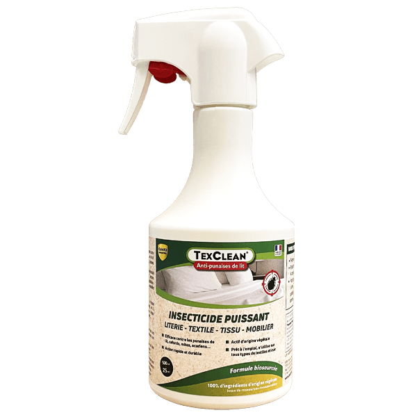 TexClean® combină insecticide chimice testate cu repelente naturale, având o eficiență ridicată împotriva ploșnițelor, căpușelor, dar și a altor insecte precum păduchi, molii, păianjen roșu, gândaci sau acarieni. În plus, citronella respinge țânțarii, muștele și furnicile, contribuind la o protecție completă a locuinței. Formula sa este sigură pentru textile și suprafețe dure, fiind ideală pentru dormitoare, sufragerii și spații interioare.